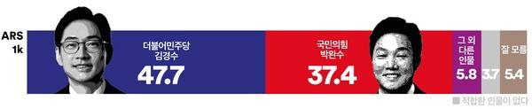 김경수 위원장은 국민의힘 유력 후보인 김태호 의원과의 가상대결에서도 47.3%의 지지율로 김태호 의원 35.5%에 비해 11.8%포인트 앞섰다.