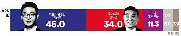 울산시장 양자 가상대결에서는 국민의힘에서 민주당으로 당적을 옮긴 김상욱 의원이 현역인 김두겸 시장을 큰 차이로 이기는 것으로 조사돼 눈길을 끌었다. 김상욱 의원은 지지율 45%로 김두겸 시장 34%에 비해 11% 포인트 앞서는 것으로 집계됐다.
