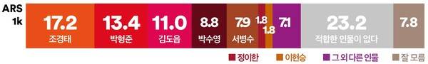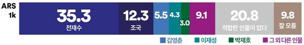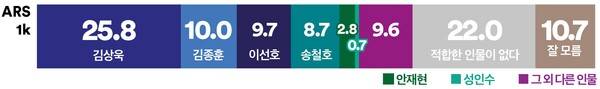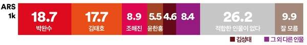 보수후보 적합도 조사에서는 박완수 경남지사 18.7%, 김태호 의원은 17.7%로 우열을 가리기 어려웠다. 다음은 조해진 전의원 8.9%, 윤한홍 의원 5.5%, 김성태 전 자유한국당 원내대표 4.6% 순이었다.