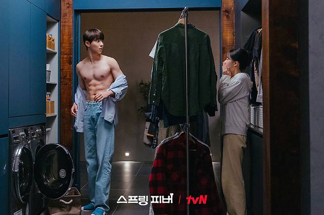 옷을 갈아입던 중 예상치 못한 순간에 최세진(이재인 분)과 마주친 한결의 당혹스러운 표정과 함께 운동으로 다져진 선명한 '초콜릿 복근'이 드러나 눈길을 사로잡는다.