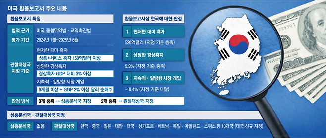 29일(현지시간) 미국 재무부는 환율보고서를 통해 한국을 관찰대상국으로 재지정했다. 중국·일본·대만·태국·싱가포르·베트남·독일·아일랜드·스위스도 포함됐다. 심층분석국은 없었다. 한국은 2016년 처음 관찰대상국으로 지정된 뒤 2023년 제외됐지만 2024년 이후 재지정되고 있다.