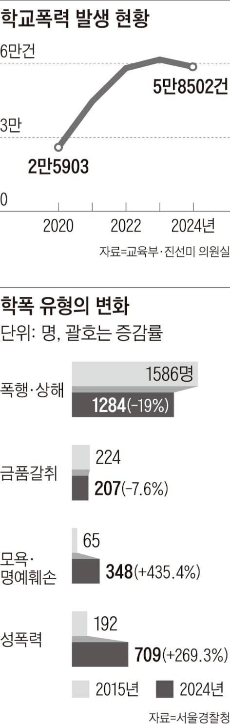 학폭이 더 은밀해지는 것은 통계로도 확인된다. 최근 10년 사이(2015~2024년) 겉으로 드러나기 쉬운 폭행·상해와 금품 갈취는 각각 19%, 7.6% 줄었지만, 모욕·명예훼손은 65건에서 348건으로 4.4배 늘어났다(서울경찰청). 성폭력도 192건에서 709건으로 2.7배 늘었다. 서울경찰청 하동진 청소년보호계장은 “CCTV 보편화로 ‘퍽치기’ 같은 금방 잡히는 범죄가 줄어든 것처럼, 학폭도 아이들이 처벌의 위험성을 학습하다 보니 눈에 보이는 폭력이 아닌 은밀하고 교묘한 형태로 변화하고 있다”고 말했다.