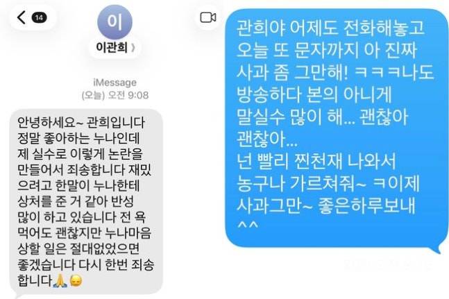 공개된 대화에서 이관희는 “정말 좋아하는 누나인데 제 실수로 논란을 만들어 죄송하다”, “재미있으려고 한 말이 상처를 준 것 같아 많이 반성하고 있다”, “전 욕 먹어도 괜찮지만 누나 마음 상할 일은 없었으면 좋겠다”며 거듭 사과했다.