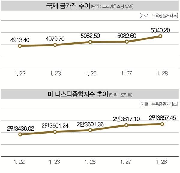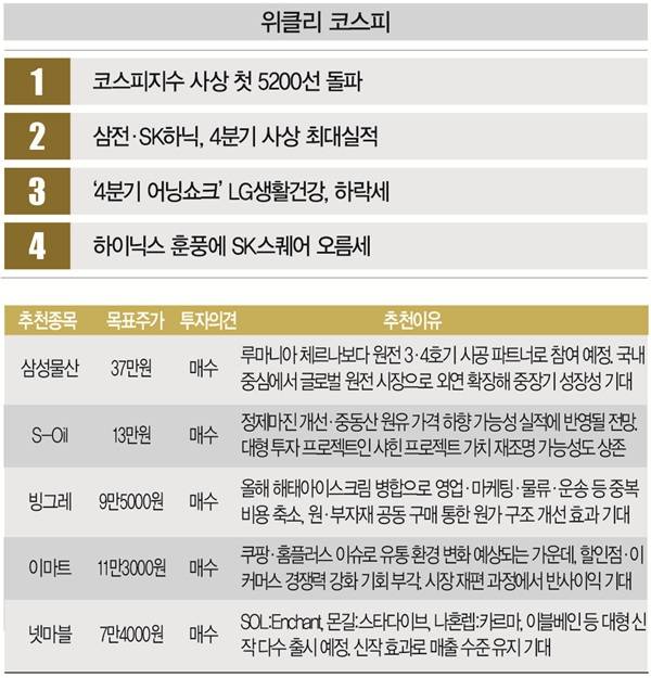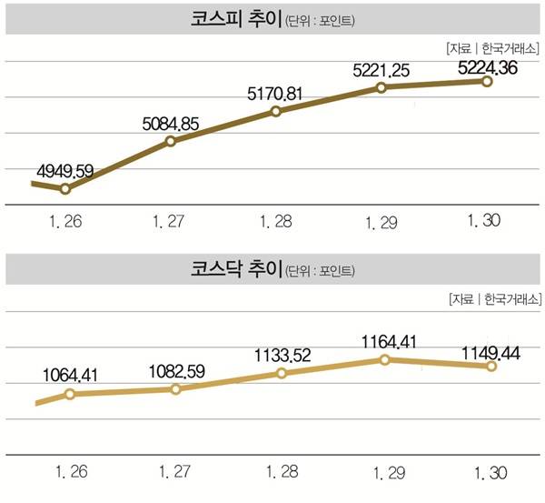 1월 27일 종가 기준 5000을 돌파한 코스피지수의 상승세는 멈추지 않았다. 28일 5170.81을 기록한 데 이어 29일 5221.25로 상승하며 5100선과 5200선을 단숨에 뚫었다.