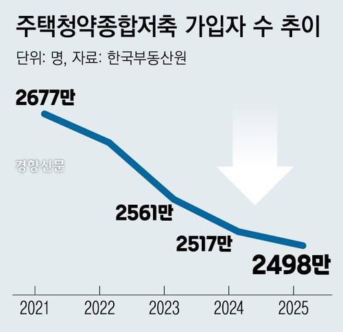 한국부동산원 청약홈을 보면 지난해 말 기준 주택청약종합저축 가입자 수는 2497만8172명으로 전년 말(2517만2173명)보다 19만명 넘게 감소했다. 갑작스러운 현상은 아니다. 청약통장 가입자 수는 2021년 2677만명으로 정점을 찍은 뒤 꾸준히 감소해 4년 새 약 180만명가량이 이탈했다.