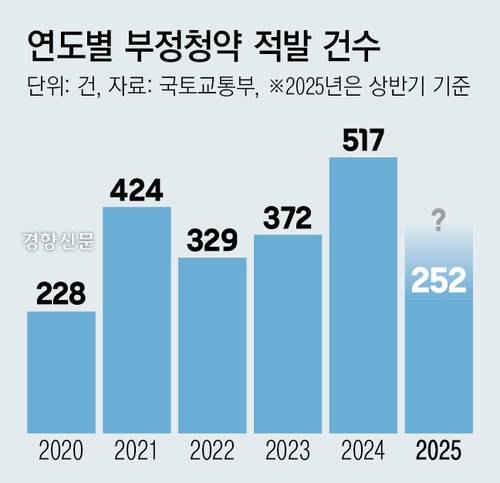 정부는 청약제도 개편보다 부정청약 단속 강화에 방점을 찍고 있다. 국토교통부의 부정청약 적발 건수는 계속 늘고 있다. 점검 첫 해인 2020년에는 228건에 그쳤지만 지난해에는 상반기에만 252건이 적발됐다. 건강보험 요양급여내역 등을 통해 실제 이용했던 의료시설을 확인하는 등 적발체계를 한층 강화한 결과다.