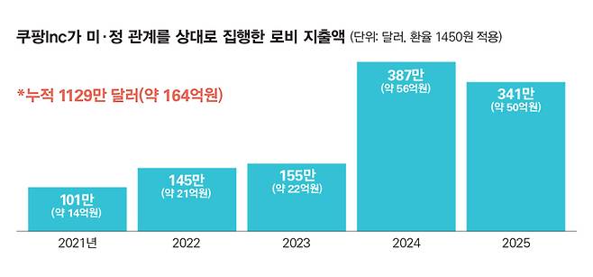 미 상·하원에 제출된 로비 보고서를 분석한 결과, 쿠팡Inc는 지난해 4분기(10~12월) 89만5000달러(약 13억원·환율 1450원 적용)의 로비 자금을 집행했다. 2025년 연간 누적액은 341만 달러(약 49억4450만원)다. 2021년부터 2025년까지 쿠팡이 미 정계와 행정부를 상대로 로비에 지출한 규모는 총 1129만 달러(163억7050만원)에 달한다. 연도별로 보면 △2021년 101만 달러 △2022년 145만 달러 △2023년 155만 달러 △2024년 387만 달러 △2025년 341만 달러를 로비에 투입했다.