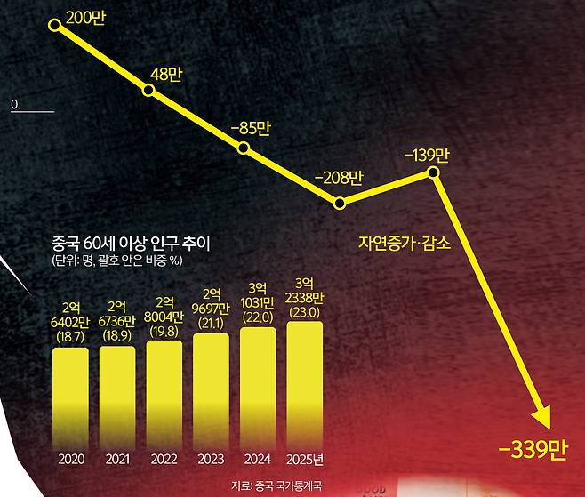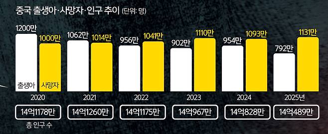 29일 중국 국가통계국에 따르면 지난해 말 기준 중국의 총인구는 14억489만명으로 전년 대비 339만명 감소했다. 지난해 중국에서 태어난 아이는 792만명이었다. 인구 1000명당 출생률은 5.63명으로 떨어졌다. 전년 대비 17% 감소한 것이다. 지난해 출생아 수와 출생률은 1949년 신중국(중화인민공화국) 건국 이후 가장 적은 기록이다. 사망자 수는 반대 방향으로 움직였다. 2025년 중국의 사망자 수는 1131만명으로 집계됐다. 로이터통신은 “사망률이 인구 1000명당 8.04명으로 1968년 이후 최고 수준”이라고 전했다. 홍콩 사우스차이나모닝포스트(SCMP)는 출생아 수와 사망자 수가 만들어낸 결과에 주목했다. 매체는 지난해 중국의 인구 감소폭 339만명을 언급하며 대기근 시기였던 1959∼1961년을 제외하면 사상 최대라고 지적했다. 단순히 인구가 줄었다는 사실보다 줄어드는 속도가 가팔라지고 있다는 점을 강조한 것이다.