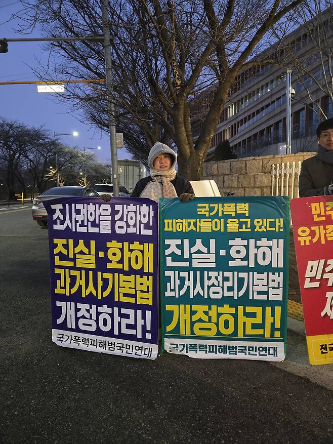 이형숙은 국회 본청의 방청석에서 이 장면을 숨죽여 지켜봤다. 지난 2년간 그는 김광동·박선영의 퇴진과 '진실·화해위원회 3기'의 출범을 위해 애써왔다. 용산 대통령실과 국회, 퇴계로의 진실·화해위 사무실을 오가며 기자회견과 일인 시위, 성명 발표를 했다. 최근 6개월은 매주 화목토 아침 7시부터 8시 30분까지 국회 앞에서 피켓 시위를 벌였다. 2024년의 12·3 내란 때처럼 이번 겨울도 힘들었다. 여의도 샛강의 칼바람은 뺨을 할퀴며 목도리 안으로 파고들었다. 볕을 쬐고 있어도 살얼음이라도 낀 듯 발가락이 쩌릿했다. 함께 행동하는 '한국전쟁 전·후 피학살자유족회'(이하 유족회) 회원들은 나이가 많아 몸이 더 시릴 터이니 바라보는 마음이 무거웠다.