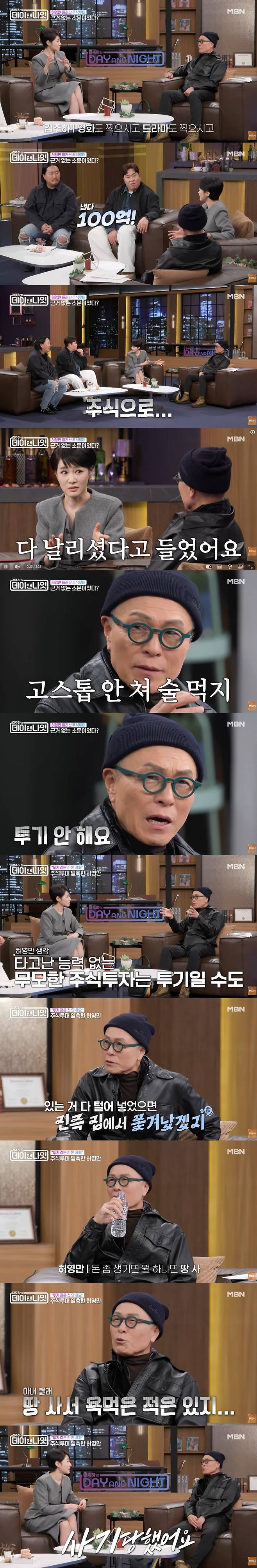 그러자 허영만은 "소문이 이렇게 나는구나"라면서 "명절이나 제사 때 식구들 모이면 고스톱 안 친다. 술 마신다. 투기 안 한다"고 했다. 그는 "주식 투자할 돈이 있으면 '너는 뭘 사겠냐' 거기서부터 주식 투자가 시작되는 거다"면서 "주식 투자를 하는 사람은 태어날 때부터 타이밍을 놓치지 않는 사람들이다. 공부를 많이 해서 되는 게 아니고 투기를 할 만큼 타고 나야 한다"고 했다.