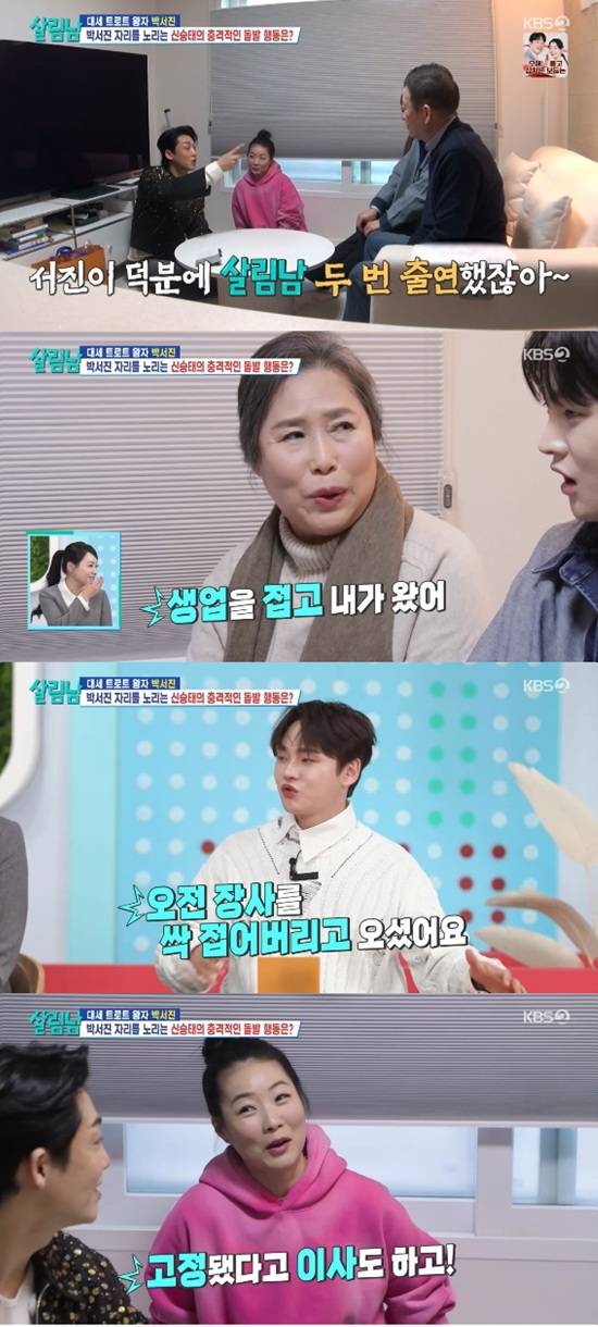 신승태 누나는 동생이 '살림남' 고정이 됐다고 이사도 예정되어 있다고 말했다. 박서진은 "'살림남' 때문에 이사까지 하는 거냐"며 놀란 얼굴을 보였다.