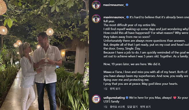 나우모프는 같은 날 자신의 SNS를 통해서도 사고 1주기를 기억하며 부모에 대한 사무친 그리움을 표현했다.