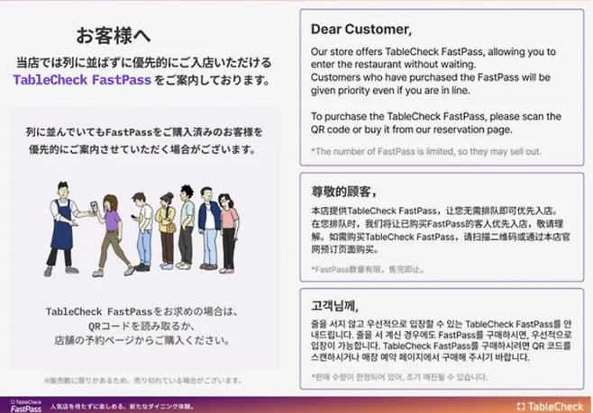 테이블 체크는 2024년 2월 9일 패스트 패스 서비스를 시작했는데, 현재 누적 이용자 수만 2만6000명에 달할 정도로 인기가 많다고 해요. 특히 웨이팅하는 시간을 아껴 다른 관광지를 다녀야 하는 방일 관광객들에게 호평받고 있다고 합니다. 이용자 중 20%가 관광객이라고 해요.