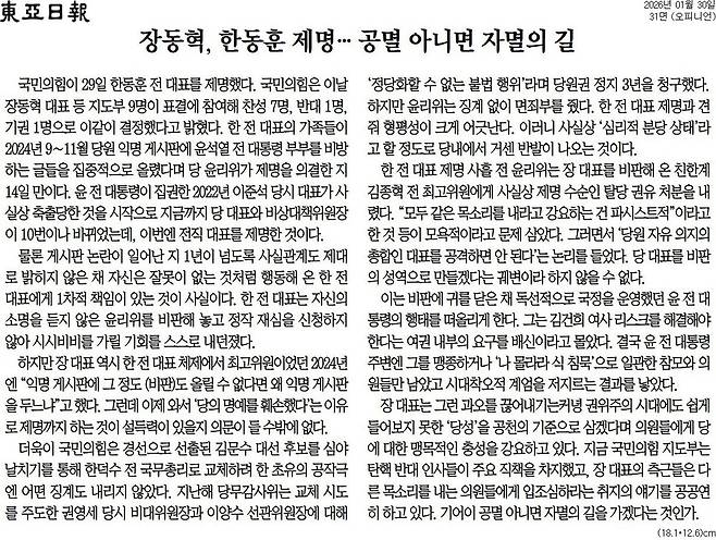 당이 깨지지 않으면 장동혁 대표에게 좋은 일일까요? 그게 그렇지가 않습니다. 차라리 당이 분열하면 각자 세를 키워서 대여투쟁에서 역할분담을 하고 총선이나 대선을 앞두고 다시 합치거나 선거 연대를 할 수도 있습니다. 하지만 지금처럼 두 세력이 서로에게 내부 총질을 계속해대면 동아일보 사설 제목처럼 ‘공멸 아니면 자멸’할 가능성이 커집니다.