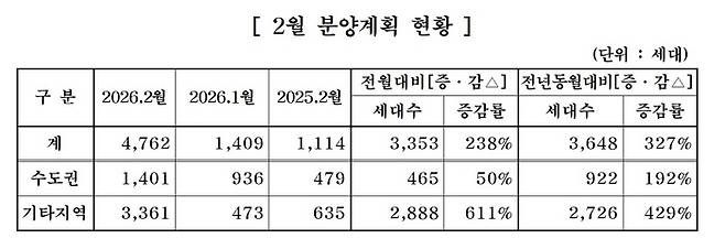 [대한경제=황은우 기자]대한주택건설협회는 회원사를 대상으로 올해 2월 주택분양계획을 집계한 결과, 8개사가 7개 사업장에서 총 4762가구를 공급하는 것으로 나타났다고 30일 밝혔다.