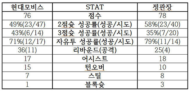 실책에서 현대모비스보다 적었던 정관장은 턴오버에 의한 득점을 14-9로 앞서며 승리와 마주했다.