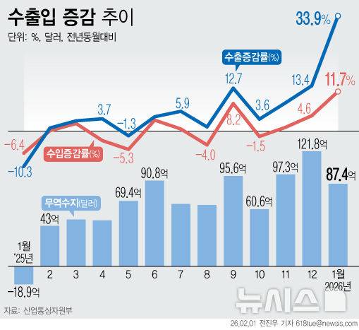 [서울=뉴시스] 1일 산업통상자원부에 따르면 지난달 수출은 전년 대비 33.9% 증가한 658억5000만 달러(약 95조5484억 원), 수입은 11.7% 늘어난 571억1000만 달러(약 82조8666억 원)를 기록했다. 특히 1월 기준으로 사상 처음 600억 달러를 넘어서는 수출 실적을 달성하면서, 올해 수출 목표인 2년 연속 7000억 달러 달성에도 청신호가 켜졌다. (그래픽=전진우 기자)