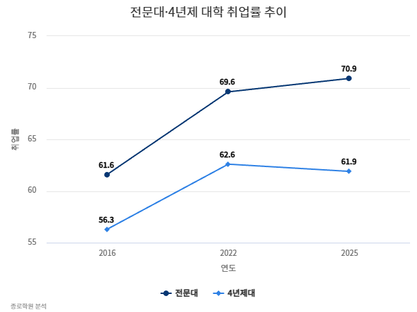 종로학원은 2025년 대학 공시자료를 분석한 결과 지난해 전국 129개 전문대의 평균 취업률은 70.9%로 2023년(71.5%) 이후 3년 연속 70%대를 돌파했다고 1일 밝혔다.