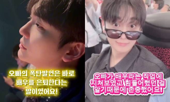 영상에서 여자 친구는 "오빠 폭탄 발언은 바로 '배우를 은퇴하겠다'는 말이었다"며 "그전에도 얘기 나눴던 주제였지만 이번엔 확고해 보였다"고 털어놨다.