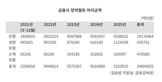 은행 19개·생명보험사 22개·손해보험사 18개 금융상품 철회금을 합한 금액으로, 제도 도입 첫해(2021년) 연 2조원대에서 2022년 4조9406억원, 2023년 5조5704억원, 2024년 5조6101억원, 2025년(생보·손보는 12월 제외) 5조5239억원으로 집계됐다.