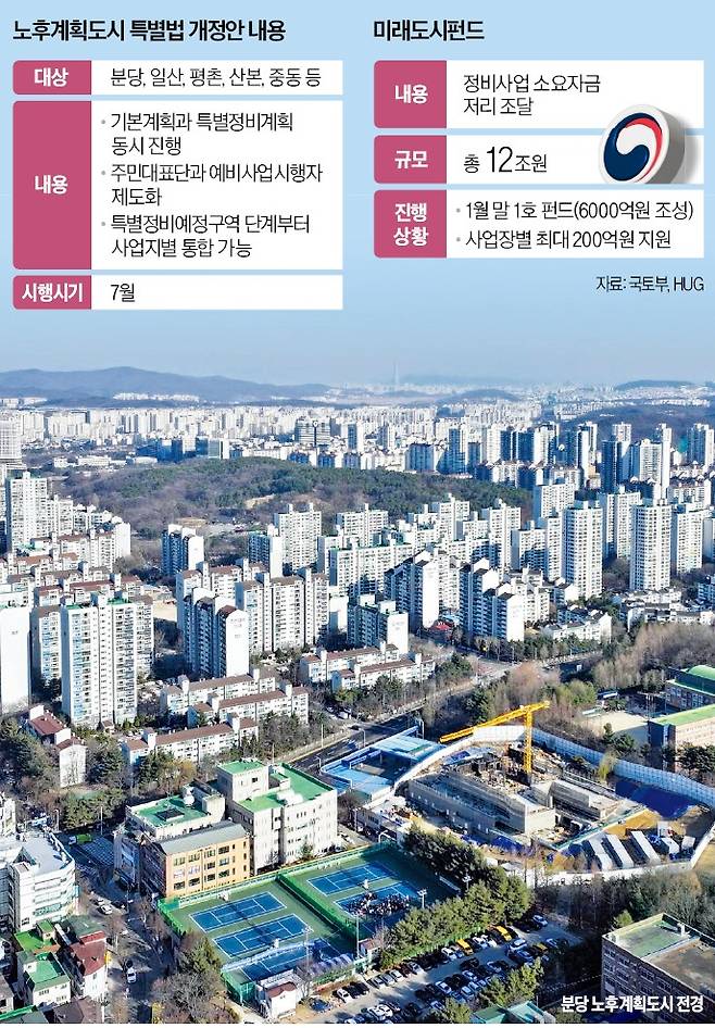 정부는 사업자금 지원을 위해 6000억원 규모 펀드 조성도 완료했다. 국토교통부는 지난달 29일 주택도시보증공사(HUG)와 함께 미래도시펀드 1호 모펀드 운용사를 최종 선정했다. 미래도시펀드는 대규모 재원이 드는 노후계획도시 정비사업의 초기 사업비·공사비 등을 HUG 보증을 통해 낮은 금리로 조달해 준다. 모펀드는 올해 상반기부터 노후계획도시 정비사업장을 대상으로 사업장별 최대 200억원의 초기사업비 융자를 시작할 예정이다.
