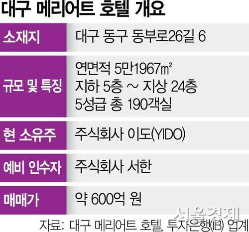 대구 메리어트는 1985년 개관한 동대구 관광호텔 자리를 허물어 2021년 재건축된 호텔이다. 대구·경북에서 비교적 긴 역사를 가진 특급 호텔로 꼽힌다. 이도는 이 자산을 2023년 인수해 운영해왔다. 지역 대표 건설사인 서한은 이번 호텔 인수를 시작으로 추후 관광·레저 분야에 진출할 뜻이 있는 것으로 전해졌다. 서한은 지난해 경북 구미에 들어설 포포인츠 바이 쉐라톤 호텔 신축 공사를 수주하기도 했다.