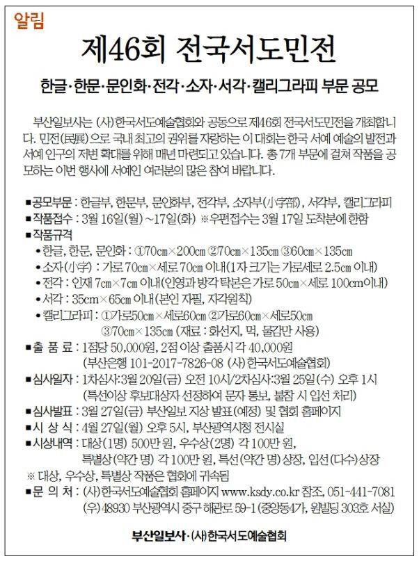 부산일보사는 (사)한국서도예술협회와 공동으로 제46회 전국서도민전을 개최합니다. 민전(民展)으로 국내 최고의 권위를 자랑하는 이 대회는 한국 서예 예술의 발전과 서예 인구의 저변 확대를 위해 매년 마련되고 있습니다. 총 7개 부문에 걸쳐 작품을 공모하는 이번 행사에 서예인 여러분의 많은 참여 바랍니다.