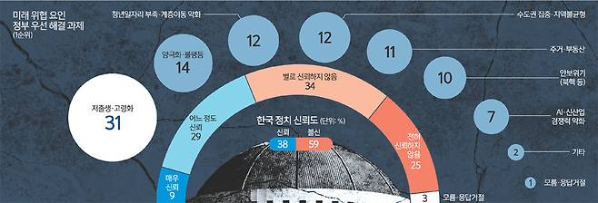 세계일보가 창간 37주년을 맞아 한국갤럽에 의뢰해 지난달 29일부터 30일까지 전국 성인 1010명을 대상으로 무선 전화면접 방식으로 실시한 여론조사 결과, 응답자의 59%는 ‘한국정치를 신뢰하느냐’는 질문에 신뢰하지 않는다고 답했다. 별로 신뢰하지 않는다는 답 34%와 전혀 신뢰하지 않는다는 답 25%를 합한 수치다. 신뢰한다는 답은 38%로 매우 신뢰한다는 9%, 어느 정도 신뢰한다는 답은 29%였다.