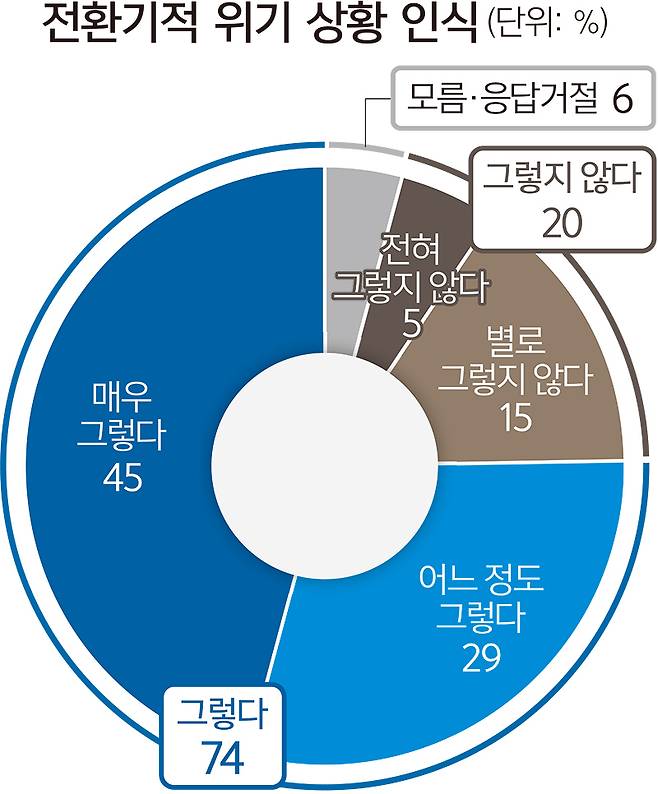 국민 4명 중 3명은 현재 한국 사회가 전환기적 위기 상황에 있다고 평가했다.