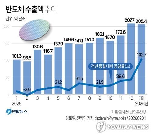 최대 수출품 반도체의 수출은 205억4천만달러로, 작년보다 2배(102.7%↑) 이상 증가하며 2개월 연속 200억달러 돌파 신기록을 세웠다. 반도체 수출은 1월 전체 수출의 32.2%를 책임졌다.