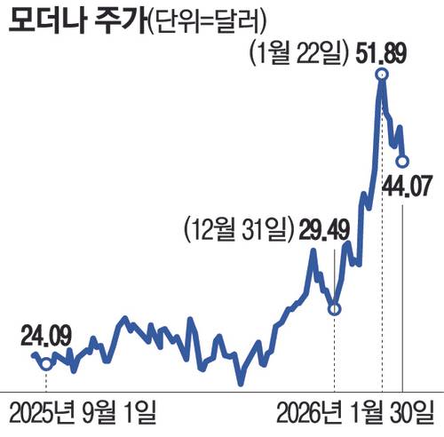 지난 1월 30일(현지시간) 뉴욕 증시에서 모더나 주가는 연초 대비 42.8% 상승한 44.07달러에 마감했다. 모더나 주가는 2021년 코로나19 백신 수요가 정점을 찍은 뒤 실적 둔화와 함께 하락세가 이어졌다. 한때 500달러에 육박했던 주가는 지난해 20달러까지 주저앉았다. 그러나 올 들어 주가는 단기간에 뚜렷한 반등 흐름을 나타내고 있다.