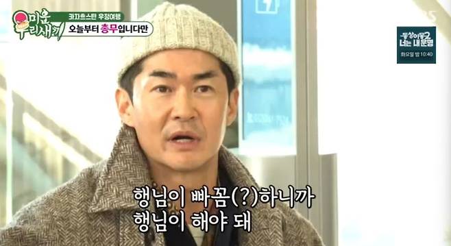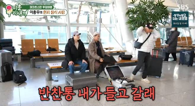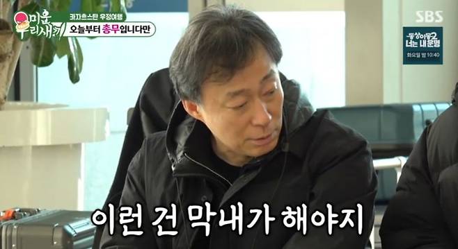 이에 이성민은 "네가 우리 여행 보내주는 거 아닌가. 막내가 해야 한다"고 주장하다가도 '이 총무'로 변신해 멤버들이 챙겨온 김치, 밑반찬, 술 등을 단속했다. 이성민은 또 "말 안 들으면 소주도 빼겠다. 난 소주 안마시니까"라며 권력을 휘두르는 것으로 웃음을 자아냈다.