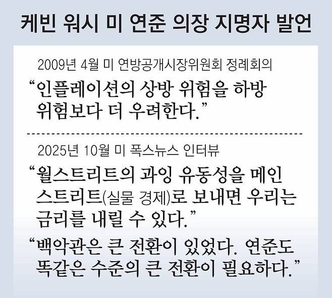 1일 국제금융센터, 한국은행 등에 따르면 워시 후보자는 연준의 양적 완화를 꾸준히 비판해 온 매파 인사다. 글로벌 금융위기 여파로 실업률이 9%로 치솟은 2009년 4월 연방공개시장위원회(FOMC) 회의에서조차 “인플레이션 상방 위험을 하방 위험보다 더 우려한다”며 일관되게 ‘돈 풀기’를 경계했다.