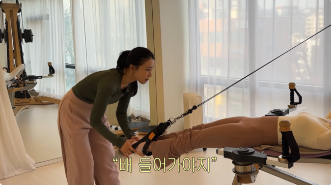 이날 핑크색 밀착 운동복을 입고 기구 위에 오른 윤승아를 향해 강사는 "배 들어가야지 배!"라고 외치며 자세 교정에 나섰다.