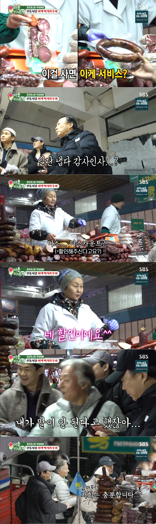 우여곡절 끝에 카자흐스탄에 도착한 이들은 현지 문화를 느끼기 위해 전통시장을 찾았다. 이색적인 풍경 속에서 멤버들의 발길을 멈추게 한 것은 현지 별미인 말고기 소시지였다. 소시지를 맛본 이성민은 “맛있어! 육포 같다”며 눈을 번쩍 떴고, 배정남 역시 “하나 살까예?”라며 만족감을 드러냈다.
