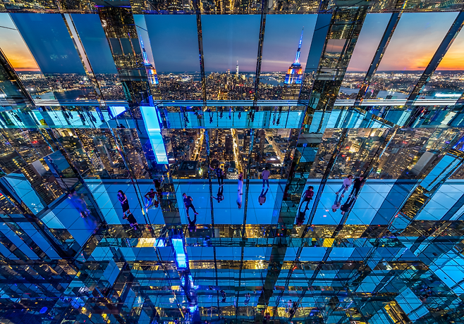 써밋 원 밴더빌트는 현재 뉴욕에서 가장 핫한 전망대다. 거울과 유리로 둘러싸인 공간에 들어서는 순간, 위와 아래, 안과 밖의 경계가 사라지며 공간감과 시간 감각마저 흐트러진다. 발아래 펼쳐진 맨해튼, 닿을 듯한 거리에 서 있는 크라이슬러 빌딩, 천장에 반사된 하늘, 그리고 무한히 반복되는 자신의 모습이 겹쳐지며, 현실과 비현실 사이를 떠다니는 듯한 느낌을 준다.