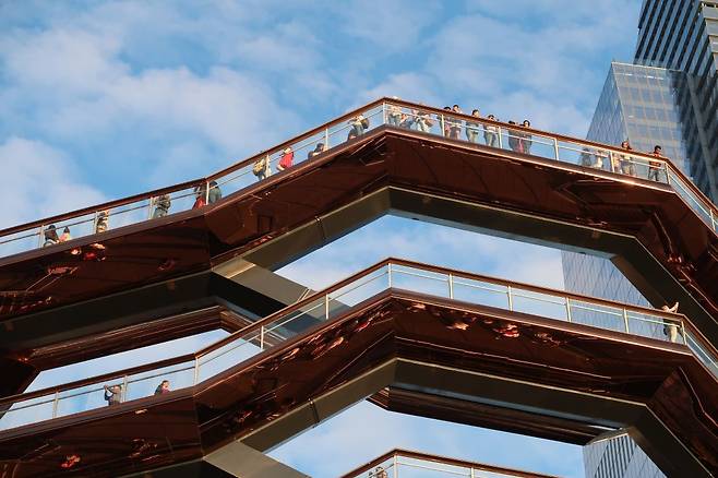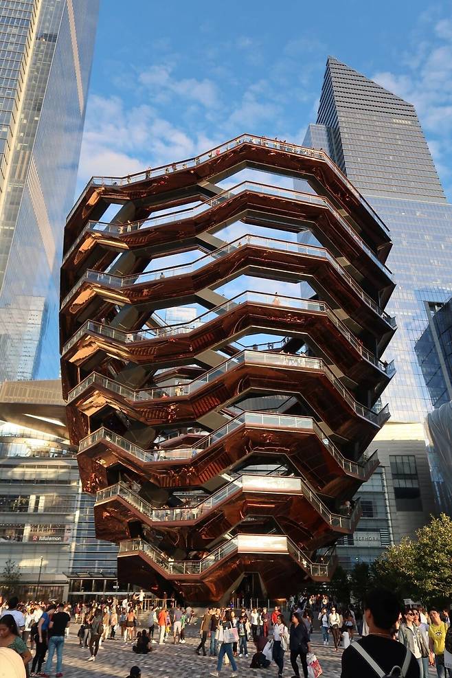 '상전벽해(桑田碧海, 뽕나무밭이 푸른 바다가 됐다)'라는 말이 정확하게 맞는 지역, 허드슨 야드. 이 지역의 랜드마크인 '베슬'은 건축물이자 예술작품이며 전망대이기도 하다. 여행객 누구나 베슬에 천천히 올라 풍경을 구경할 수 있다. 엘리베이터가 있기는 하지만 장애인 전용이다. 베슬의 계단 총 개수는 2,500개. 높이로 치면 아파트 15층 정도 높이지만 360도 구경하며 올라가다 보면 그리 힘들진 않다. 벌집 모양인 구조물을 하나하나 오를수록 풍경이 미묘하게 달라지는 점은 베슬의 묘미. 오르는 과정 자체가 경험이 되는 곳이다.