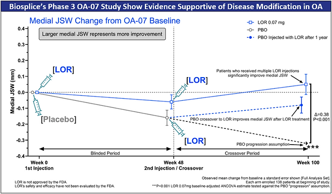 하지만 바이오스플라이스의 임상 3상 장기 연장시험(OA-07)에서 로어시비빈트를 맞은 환자들은 이 JSW가 2년 동안 줄어들지 않고 그대로 유지되거나 오히려 넓어지는 결과를 보였다. 반대로 위약을 맞은 환자들은 첫해에 관절 간격이 눈에 띄게 좁아졌다. 하지만 이후 로어시비빈트로 약을 바꾸자 다시 관절 간격이 넓어지는 변화가 관찰됐다.