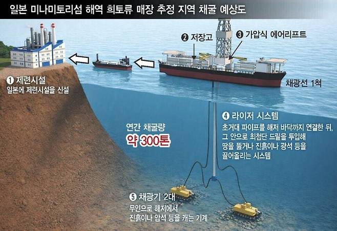 도쿄에서 1860㎞ 떨어진 일본 최동쪽 섬 미나미토리섬 해저에서는 지난 2013년 대량의 희토류를 함유한 진흙층이 처음 처음 발견됐다. 당시 가토 야스히로 도쿄대 교수 연구팀과 일본 해양연구개발기구 등은 일본 배타적경제수역(EEZ)에서 발견된 이 진흙 안에 고농도 희토류 1600만톤이 존재하는 것으로 추정했다. 현재 국가별 매장량 기준으로 중국(4400만톤), 브라질(2100만톤)에 이어 세계 3위 수준이다.