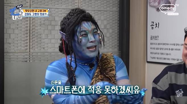 이날 방송에서 김해준은 영화 '아바타'의 '나비족' 분장으로 등장해 출연진을 당황 시켰다. 지난 녹화 도중 프로그램이 10년 동안 지켜온 규칙인 '한입만' 룰을 깨트린 죄로 분장 벌칙을 받게 된 것. 온 몸을 파랗게 칠한 김해준은 "스마트폰 얼굴 인식이 안 된다. 불편해서 아무것도 못하겠다"며 지난 날의 과오를 후회한다.