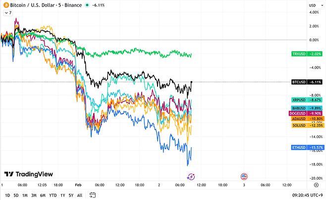 솔라나와 에이다가 12.35%, 10.80% 하락하며 뒤를 이었고, 도지코인, BNB, XRP도 9% 가량 하락했다.