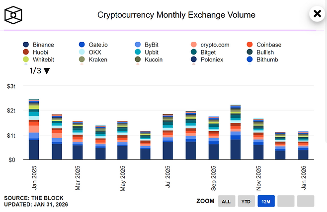 2일 더블록에 따르면 전세계 가상자산거래소의 1월 현물 거래 대금은 1조1300억달러로 집계됐다.
