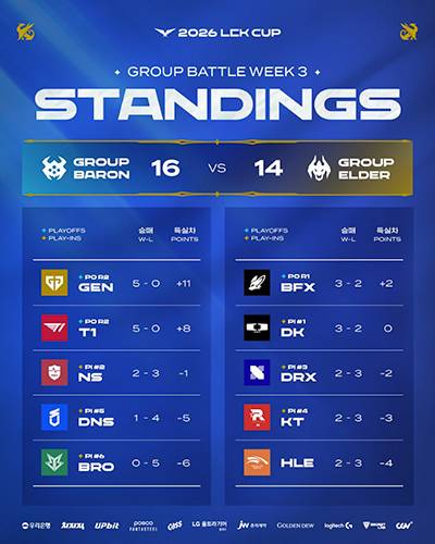 ‘리그 오브 레전드(LoL)’ 이스포츠의 한국 프로 리그인 리그 오브 레전드 챔피언스 코리아(LCK)를 주최하는 라이엇 게임즈는 1월 28일(수)부터 2월 1일(일)까지 서울 종로구 그랑서울에 위치한 치지직 롤파크에서 2026 LCK컵 3주 차가 ‘슈퍼 위크’로 진행됐고 플레이-인과 플레이오프에 진출한 팀들이 결정됐다고 밝혔다.