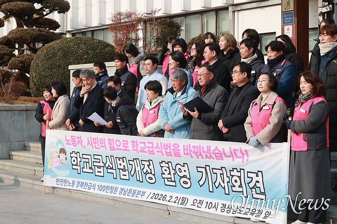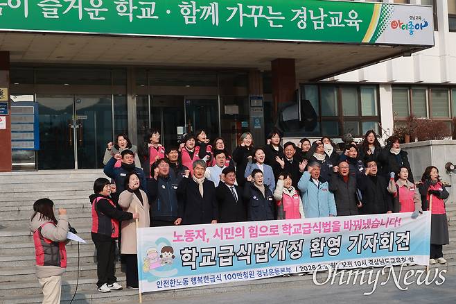 | ▲ ‘안전한 노동, 행복한 급식 100만청원 경남운동본부’는 2일 경남교육청 앞에서 “노동자, 시민의 힘으로 학교급식법을 바꿔냈다”라며 환영 입장을 밝혔다. |