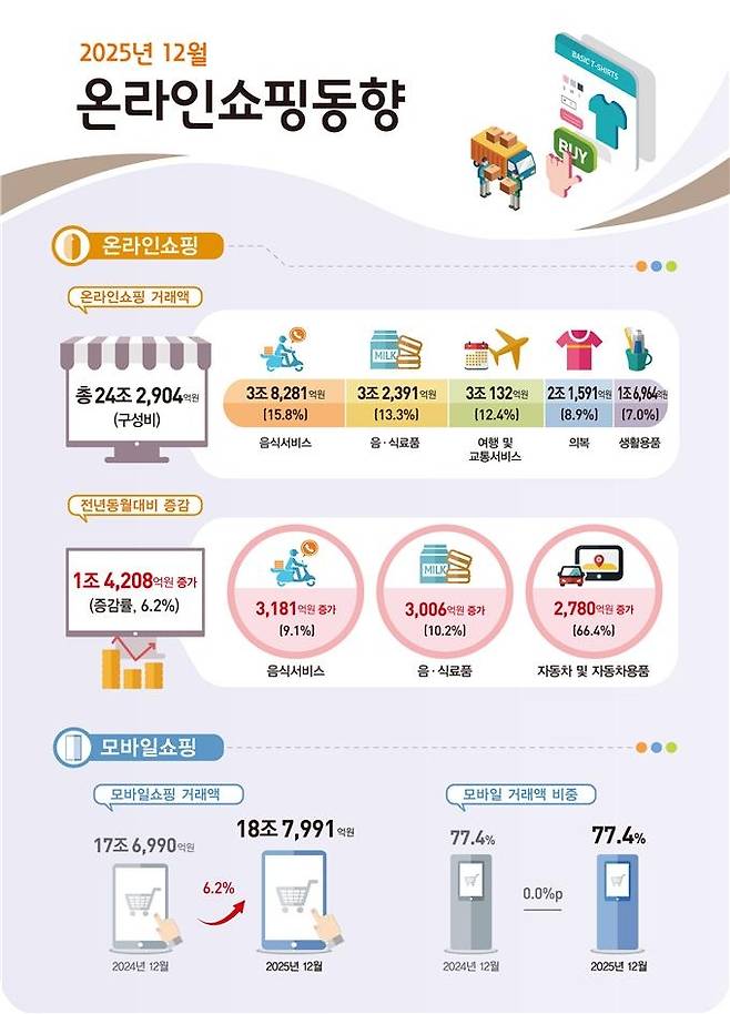 국가데이터가 2일 발표한 '2025년 12월 및 연간 온라인쇼핑 동향'에 따르면 지난해 온라인쇼핑 거래액은 1년 전보다 4.9% 증가한 272조398억원으로 집계됐다.