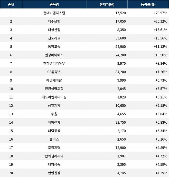 [서울데이터랩]현대비앤지스틸 29.97% 상한가…금일 증시 상승률 1위로 마감