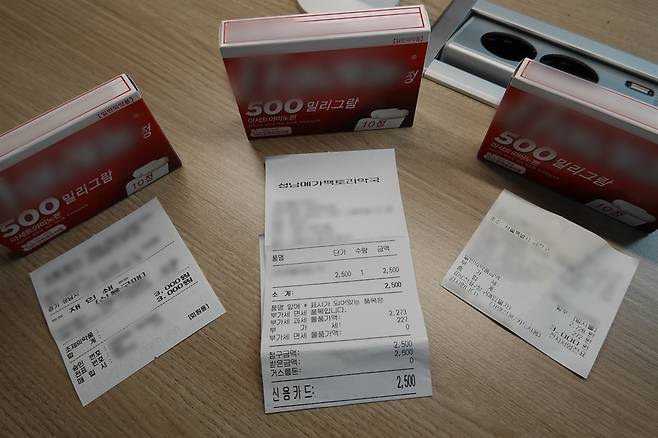 | ▲ 경기도 성남시의 창고형 약국(중앙)과 동네 약국(좌), 서울 금천구의 동네 약국(우)에서 2026년 1월 28일 구매한 해열진통제와 영수증. 인터뷰에 참여한 약국과 무관함. |
