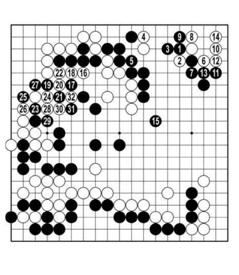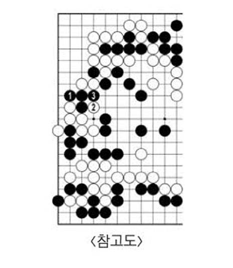 백14까지 귀에서 산 것보다 흑15로 모양을 넓히는 것이 빛난다. 흑한테 둘러싸인 가운데 백돌들이 16 맥점 덕에 흑 다섯 점을 잡고 살았다. 이창호는 흑 다섯 점을 버리며 판을 끝낼 기회를 만들었다. 그렇게 잘 두어놓는데 정작 결정타 앞에서 엎어졌다. <참고도> 흑1로 백 여섯 점을 잡았으면 이 바둑을 지는 일은 없었을 것이다.