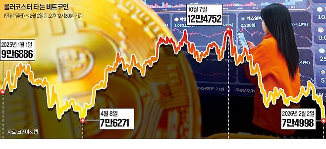 비트코인이 하루 새 5% 가까이 급락하며 한때 7만5000달러가 붕괴했다. 글로벌 암호화폐 시가총액은 이틀 새 2500억달러(약 360조원)가 증발했다. 표면적으로는 매파(통화 긴축 선호)로 분류되는 케빈 워시 전 미국 중앙은행(Fed) 이사가 차기 Fed 의장에 지명된 이른바 ‘워시 쇼크’가 작용했다. 하지만 안전자산인 금뿐 아니라 위험자산인 주식과도 탈동조화(디커플링)하는 모습을 보이면서 비트코인의 자산적 가치에 의문이 커졌다는 해석도 나온다.