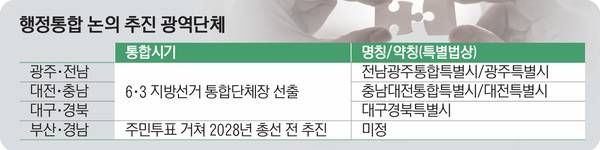 2일 행정안전부 등에 따르면 광주·전남, 대전·충남, 대구·경북, 부산·경남 등은 정부의 ‘5극 3특 전략’에 따라 행정통합 논의 절차에 착수했다.